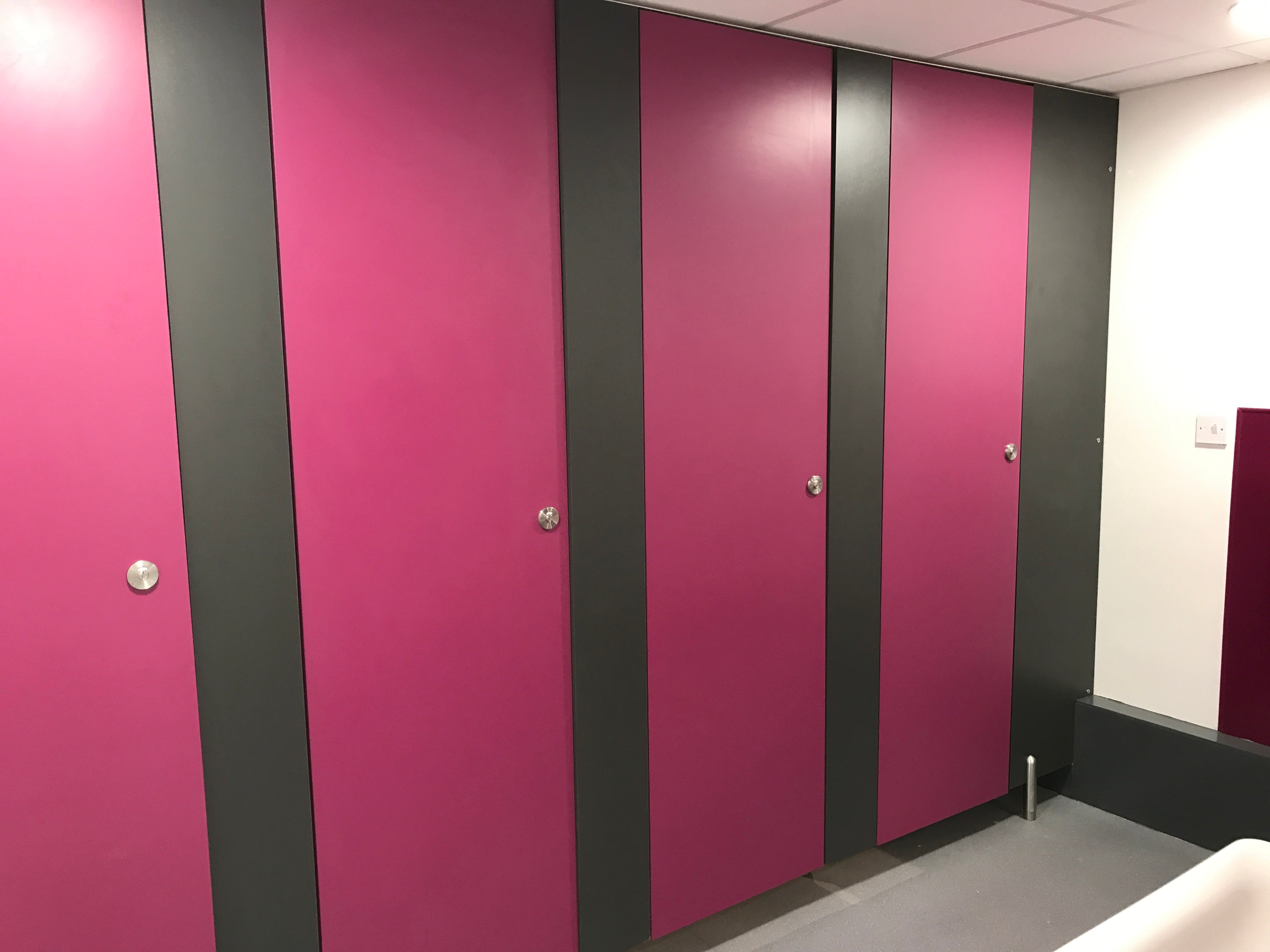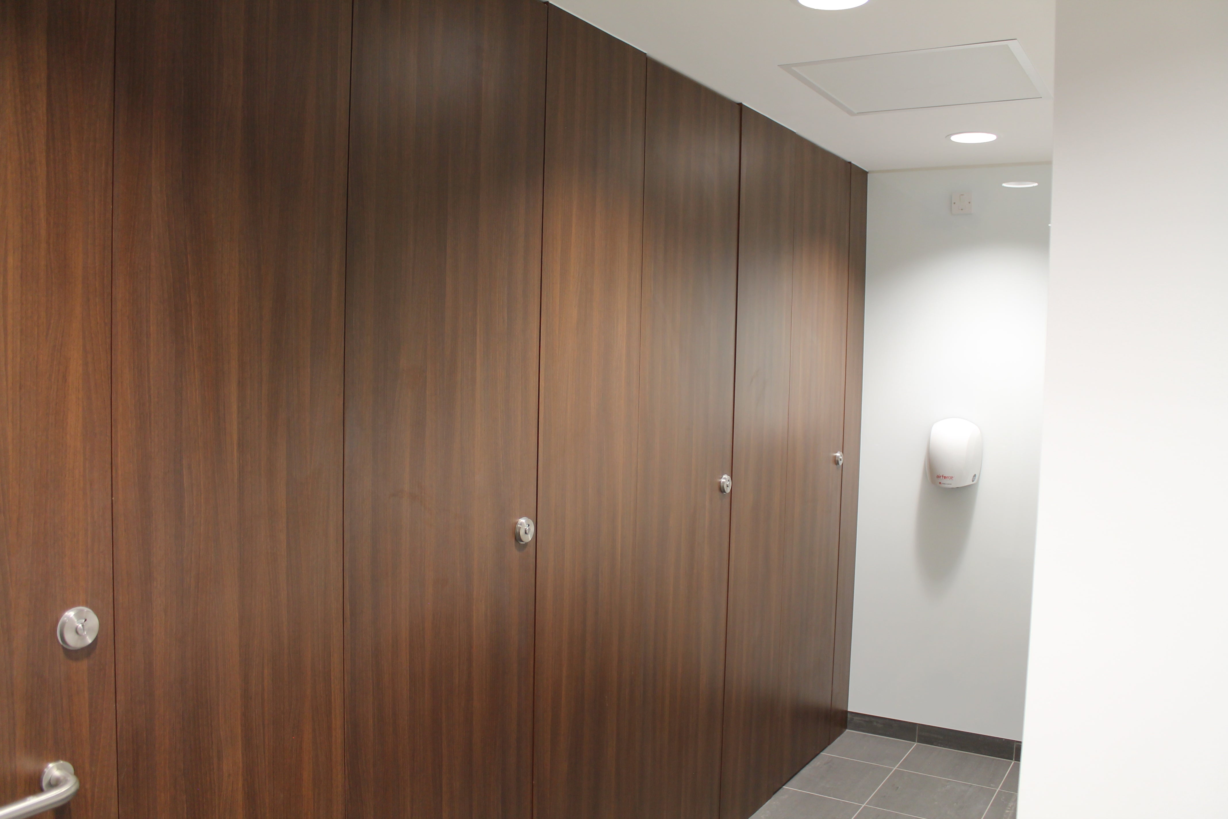 Cubicle dividing panels are standard 18mm MR Melamine Faced chipboard. All ironmongery satin stainless steel.